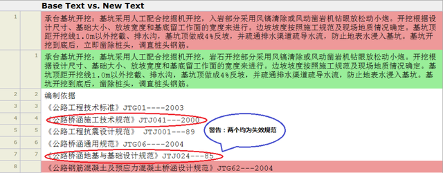 例如,2018年3月份的一個項目,在開標評審過程中,計算機發(fā)現(xiàn)兩家企業(yè)的技術標函在“承臺基坑開挖”工序的描述中存在大段相似內(nèi)容,更為離譜的是兩份標書中均出現(xiàn)了使用失效規(guī)范的情況,《公路橋涵施工技術規(guī)范》JTJ041-2000(已修訂為JTG/T F50-2011)、《公路橋涵地基與基礎設計規(guī)范》JTJ024-85(已修訂為JTG D63—2007)。