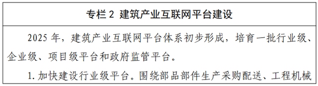 開(kāi)展建筑產(chǎn)業(yè)互聯(lián)網(wǎng)平臺(tái)建設(shè)試點(diǎn),培育一批行業(yè)級(jí)、企業(yè)級(jí)、項(xiàng)目級(jí)建筑產(chǎn)業(yè)互聯(lián)網(wǎng)平臺(tái),建設(shè)政府監(jiān)管平臺(tái)。