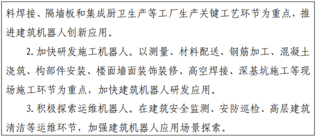 推動(dòng)在材料配送、鋼筋加工、噴涂、鋪貼地磚、安裝隔墻板、高空焊接等現(xiàn)場(chǎng)施工環(huán)節(jié),加強(qiáng)建筑機(jī)器人和智能控制造樓機(jī)等一體化施工設(shè)備的應(yīng)用。