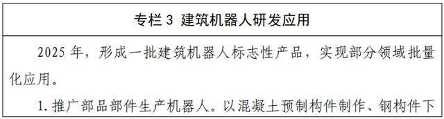 積極推進(jìn)建筑機(jī)器人在生產(chǎn)、施工、維保等環(huán)節(jié)的典型應(yīng)用,重點(diǎn)推進(jìn)與裝配式建筑相配套的建筑機(jī)器人應(yīng)用,輔助和替代“危、繁、臟、重”施工作業(yè)。