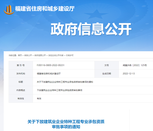 ▌福建省:2023年1月1日起,下放建筑業(yè)企業(yè)特種工程專業(yè)承包資質(zhì)審批事項2020年12月21日,福建省住建廳發(fā)布《關(guān)于下放建筑業(yè)企業(yè)特種工程專業(yè)承包資質(zhì)審批事項的通知》。明確2023年1月1日起,在已下放企業(yè)建筑業(yè)企業(yè)專業(yè)承包一、二級資質(zhì)審批權(quán)限的基礎(chǔ)上,將建筑業(yè)企業(yè)特種工程專業(yè)承包資質(zhì)也下放至各設(shè)區(qū)市和平潭綜合試驗區(qū)審批,省廳不再受理該審批事項。