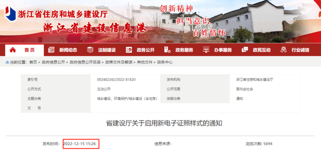 ▌浙江省:2023年1月1日起,二級建造師等6類電子證照啟用新樣式。2022年12月15日,浙江省住建廳發(fā)布《省建設(shè)廳關(guān)于啟用新電子證照央視的通知》,其中,浙江省核發(fā)的建筑施工企業(yè)安全生產(chǎn)許可證、二級建造師注冊證書、二級注冊建筑師注冊證書、二級注冊結(jié)構(gòu)工程師注冊執(zhí)業(yè)證書、建筑施工企業(yè)安全生產(chǎn)管理人員考核合格證書、建筑施工特種作業(yè)操作資格證書等電子證照樣式按標準進行調(diào)整,于2023年1月1日起啟用新樣式電子證照。